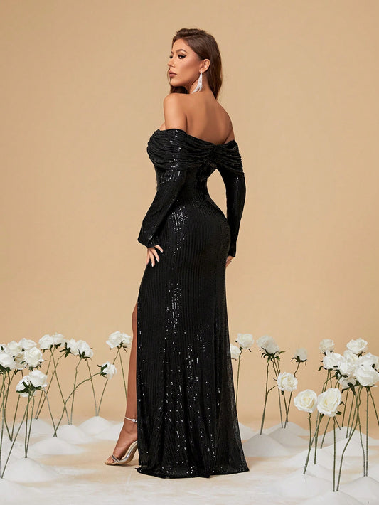 Elegant Black Sequin Off-Shoulder High Slit Long Sleeve Maxi Dress-Free Shipping