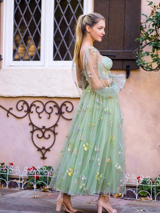 Elegant Floral Embroidered Tulle Lace Bishop Sleeve Maxi Dress – Free Shipping