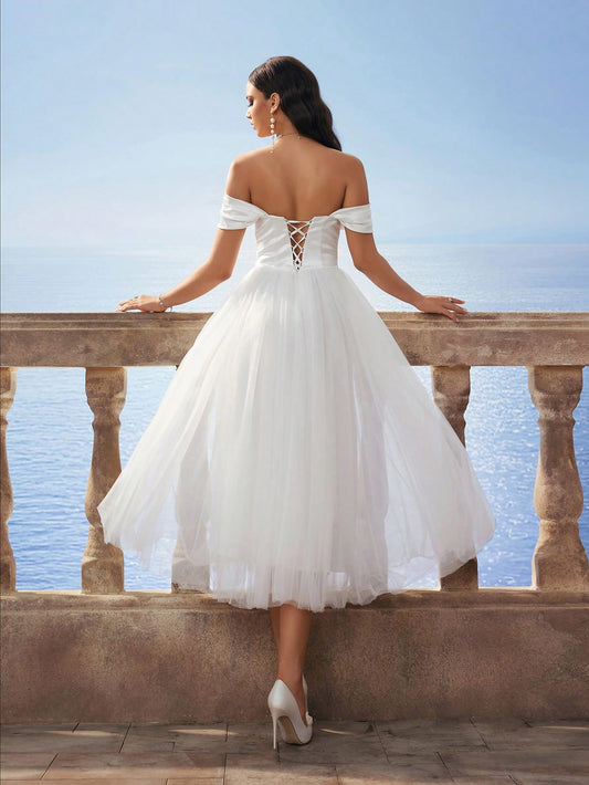 Timeless Sweetheart Off-Shoulder Chiffon A-Line Slit Midi Wedding Dress – Free Shipping