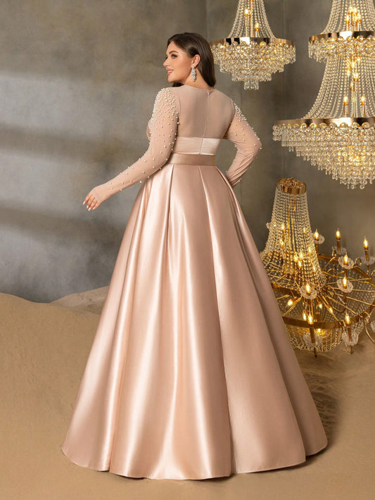 Elegant Plus Size Pearl Embellished Belted Long Sleeve Satin Ball Gown Dress-Free Shipping