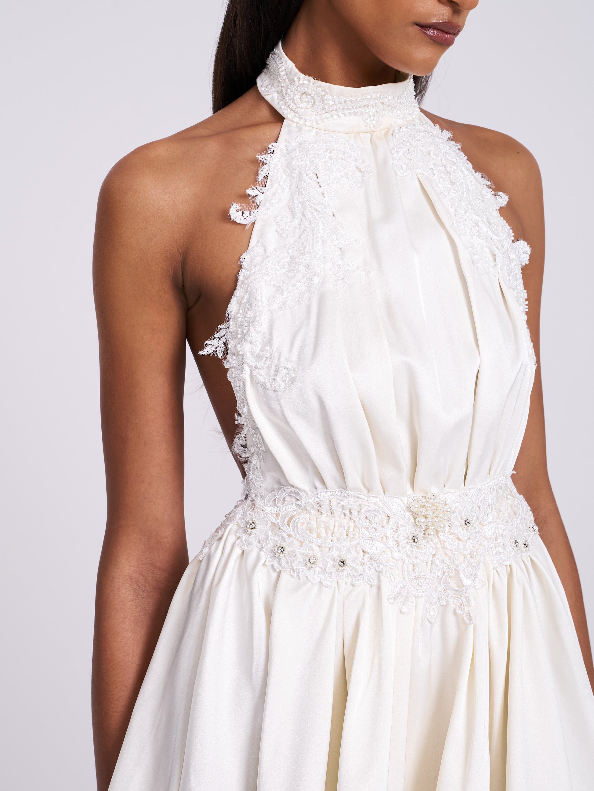 Step into elegance with the Idalia Dress, a timeless piece designed to make you shine at any wedding, engagement, formal event, or summer party. Crafted from luxurious silky fabric in a radiant pearl white hue, this dress features a sophisticated halter neck and alluring backless design, perfect for making a statement. The ruched front adds a flattering touch, while the delicate beaded lace trim and trimmed skirt bring a hint of romantic charm. With a chic mid-waist silhouette, fully lined interior, and an invisible zipper for a seamless finish, the Idalia Dress is perfect for dancing the night away or celebrating a special birthday in style.
