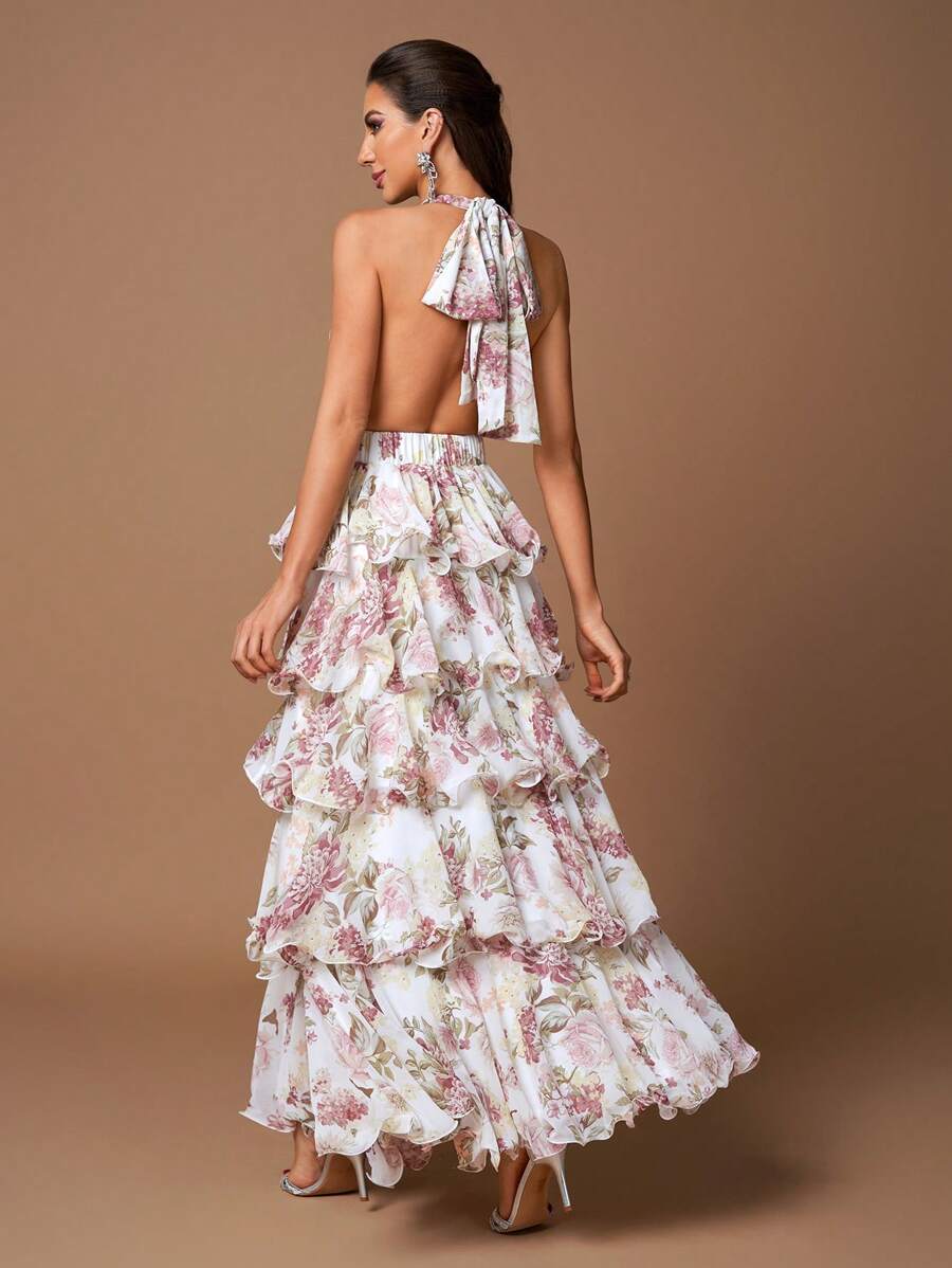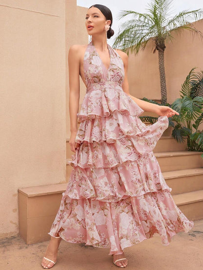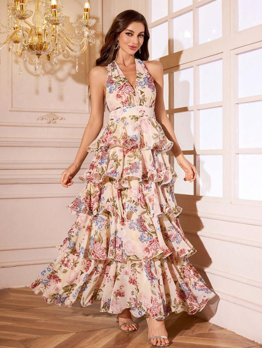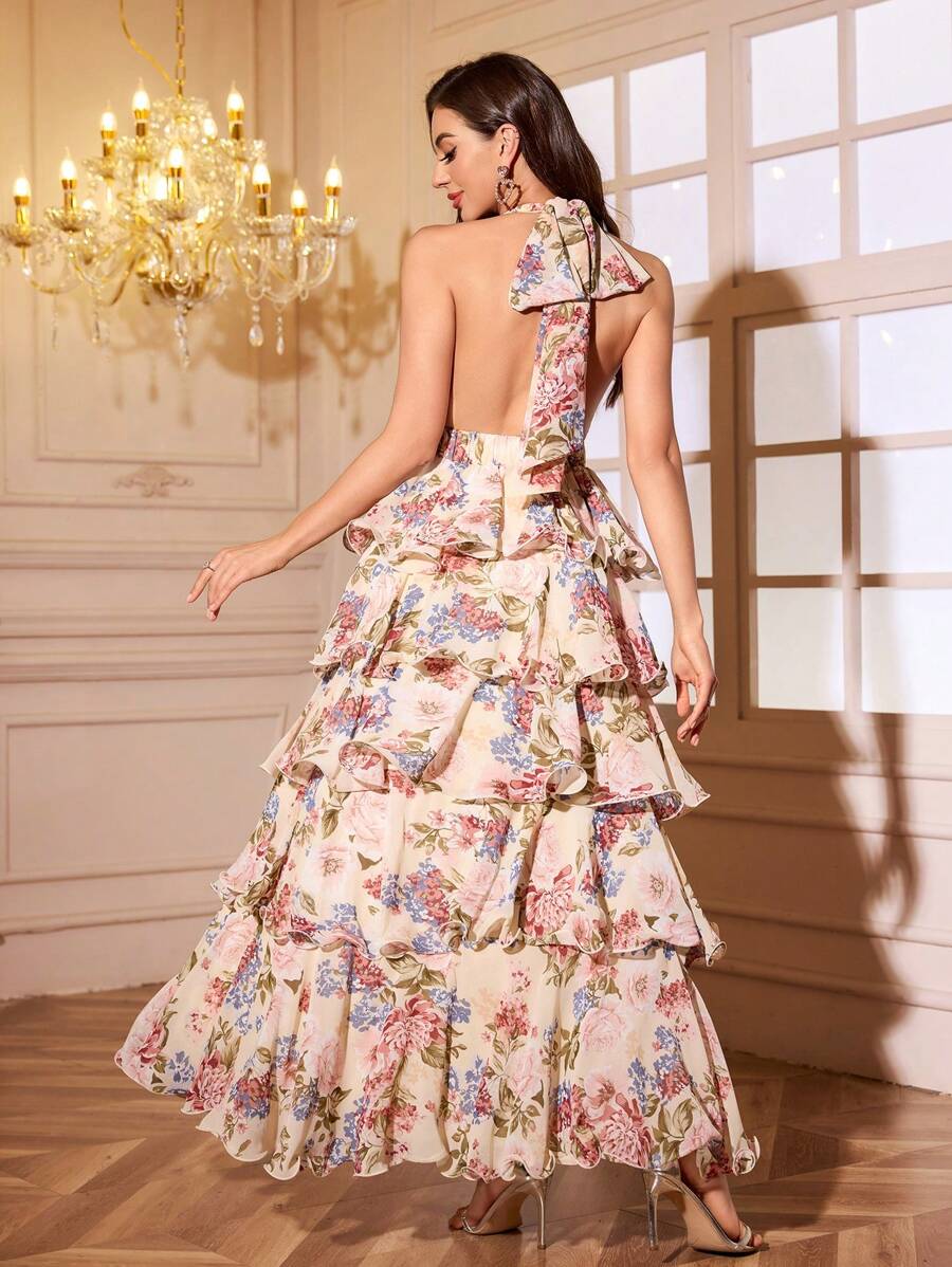 Sexy Floral Halter V-Neck Open Back Ruffle Tiered A-Line Maxi Dress – Free Shipping