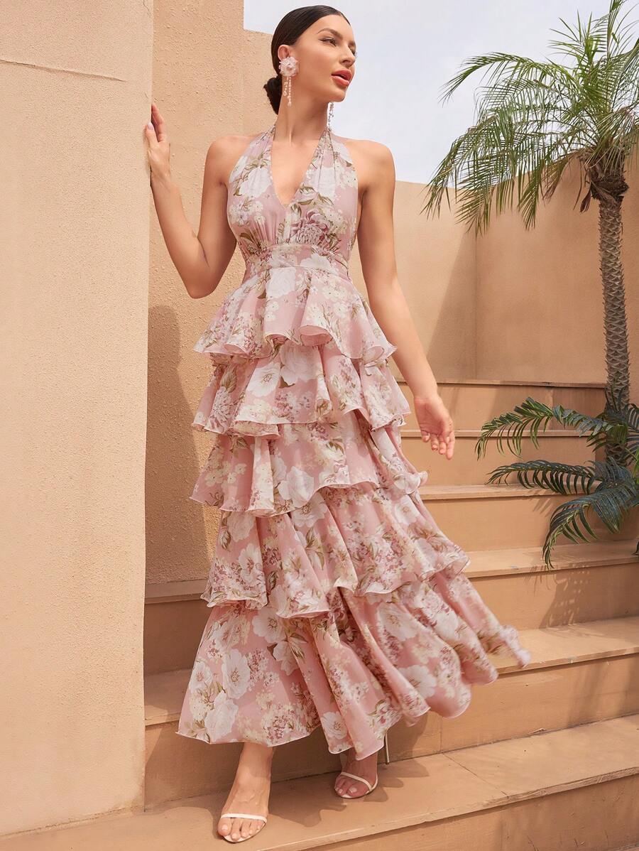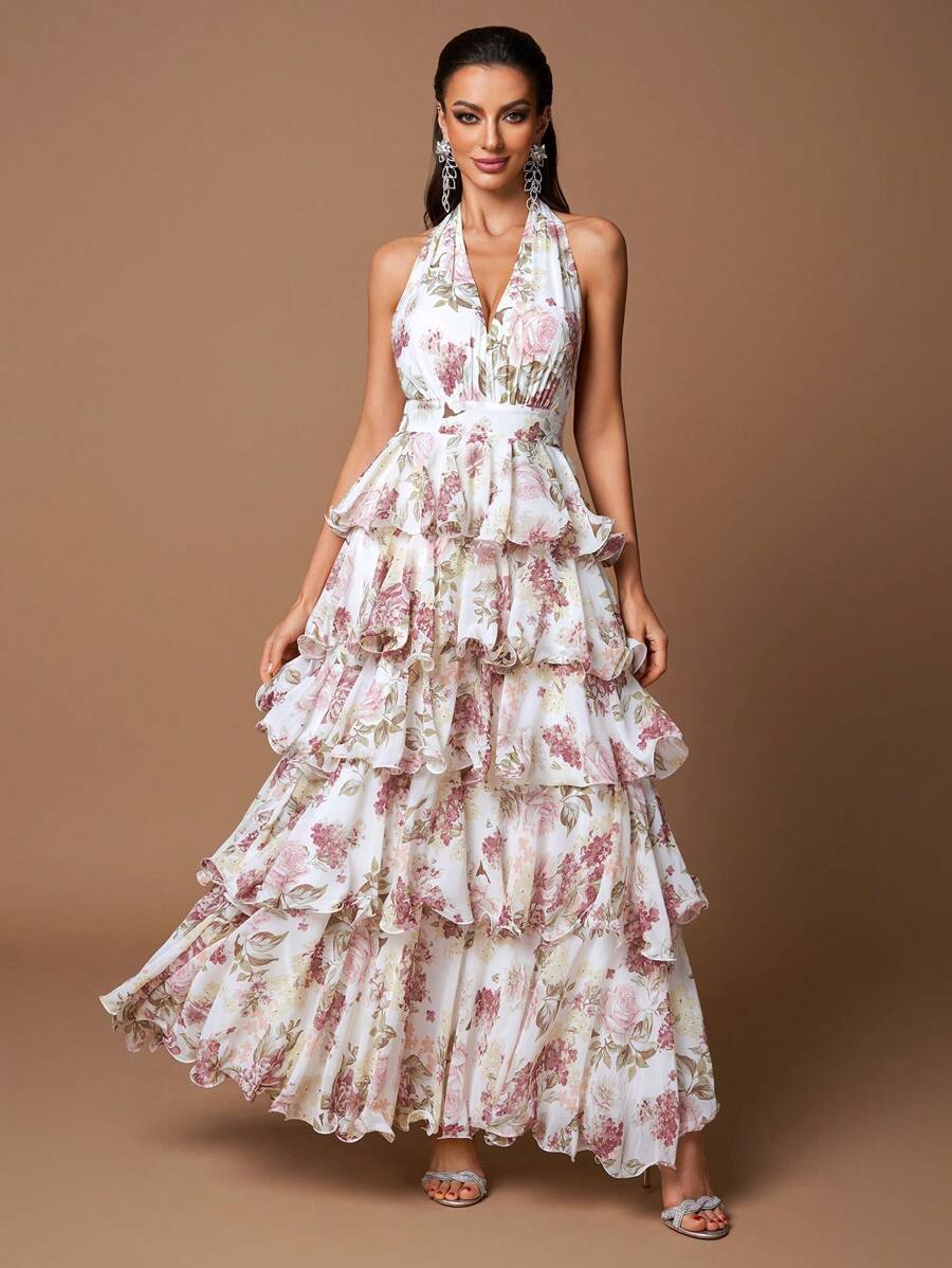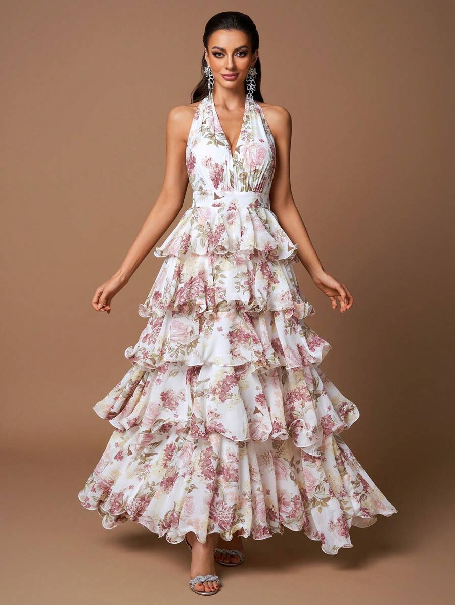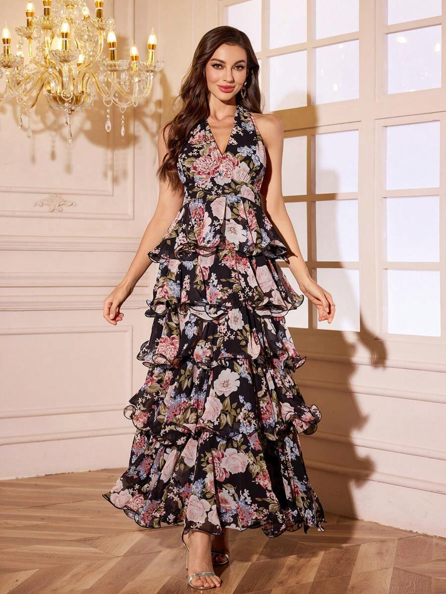 Sexy Floral Halter V-Neck Open Back Ruffle Tiered A-Line Maxi Dress – Free Shipping