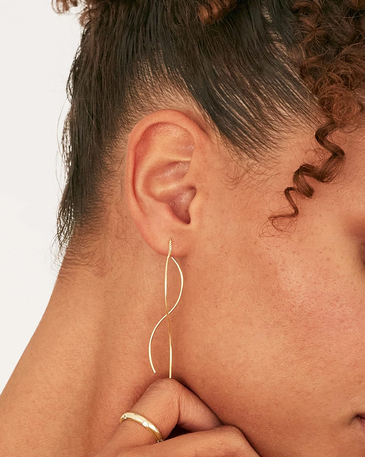 Introducing our exquisite Stylish Curved Dangle 14K GP Double Threader Earrings. Crafted with premium materials and a stunning design, these earrings offer both style and comfort. The push-back closure ensures a secure fit, while the double threader design adds a touch of elegance. Enjoy free shipping on these luxurious earrings.
