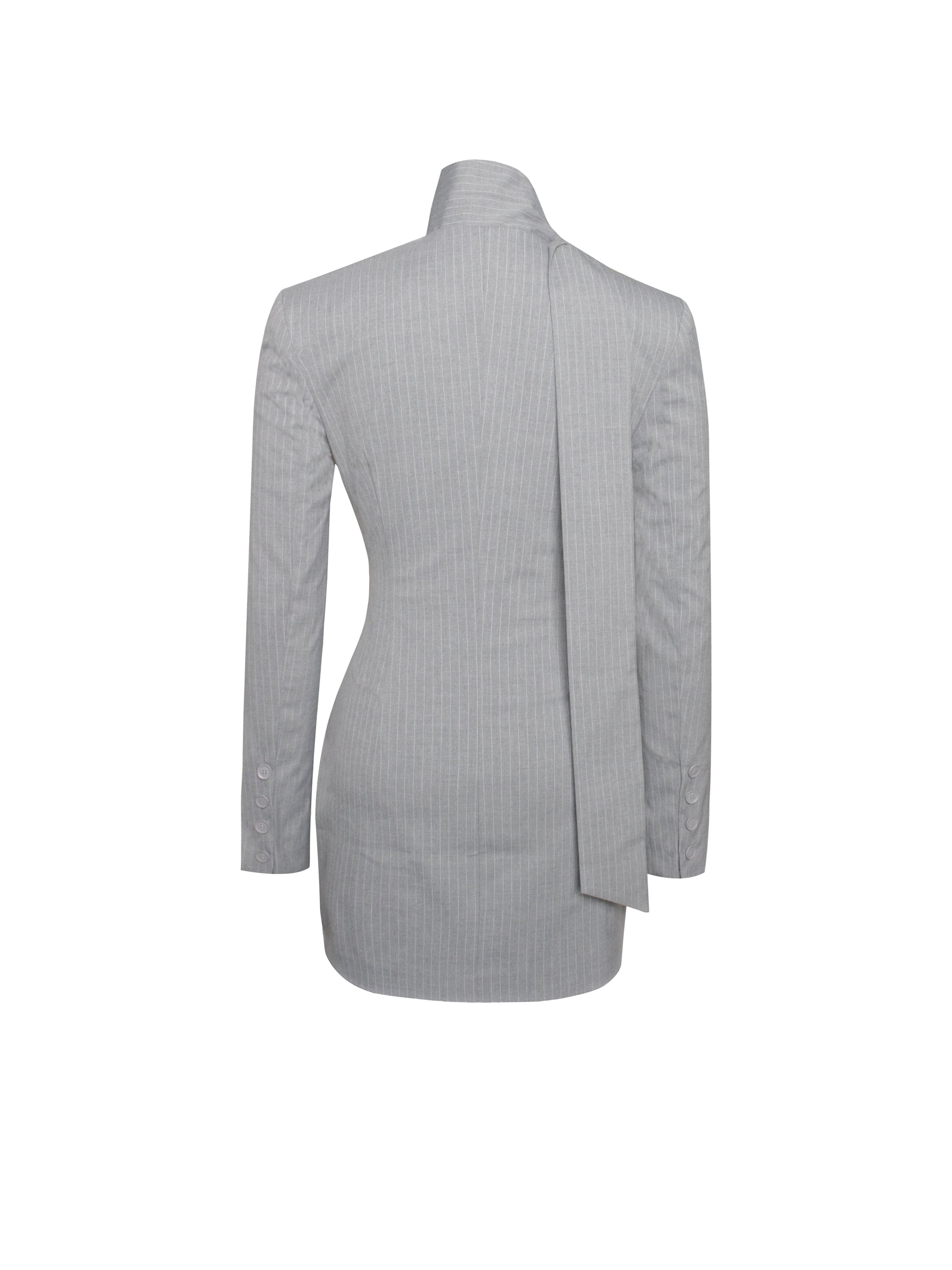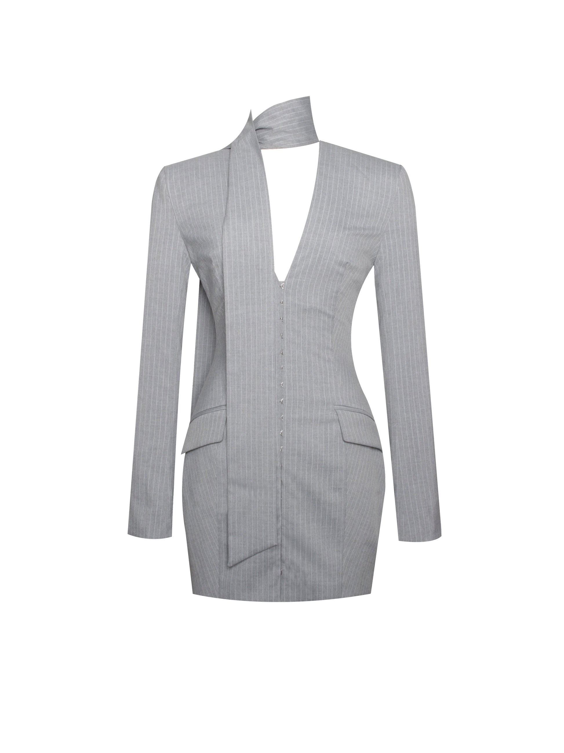Miss Circle Tahlia Deep V Pinstripes Gray Blazer Dress with Scarf Collar - Free Shipping
