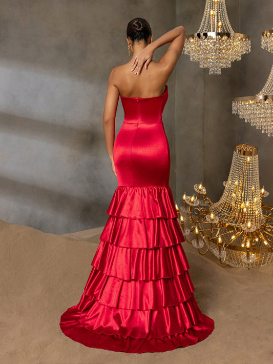Sophisticated Red Strapless Ruffled Layered High-Slit Mermaid Bodycon Dress - Free Shipping