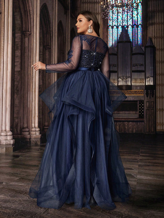 Graceful Plus Size Sequin Embellished Sheer Sleeves A-Line Maxi Gown - Free Shipping